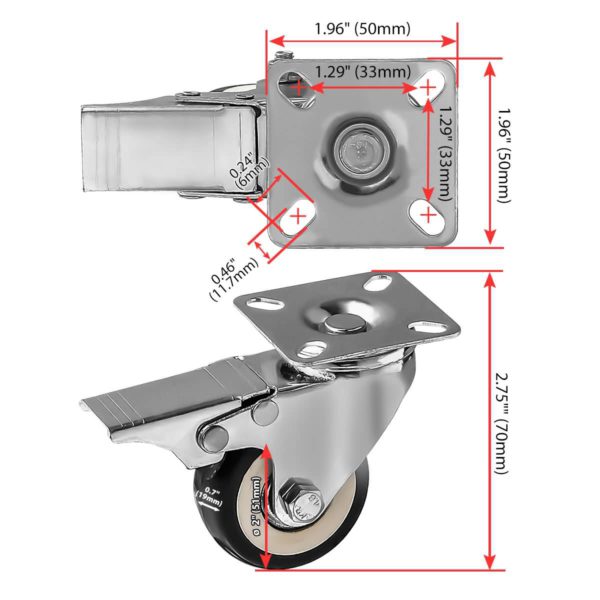 PLATE SIZE: 50mm, 1.96″ X 50mm, 1.96″. Hole Center To Hole Center: 33mm, 1.29″. 2 inch Caster Wheels with Brake.