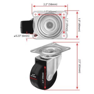 CASTER WHEELS: Plate ball bearing for each wheel, moving smooth, the load capacity for each casters is more than 65lbs. Plate Size: 1.9″ (49mm) x 2.2″ (58mm). Hole center to hole center: 1.3″ (35mm) x 1.7″ (45mm). Mounting hole dimensions: 0.23″ (6mm) round). Overall Height: 2.5″ (65mm). Caster Wheel Diameter: 2″ (50mm). Caster Wheel Width: 0.8″ (21mm). Caster Wheel Material: Rubber. Caster Wheel Color: Black.
