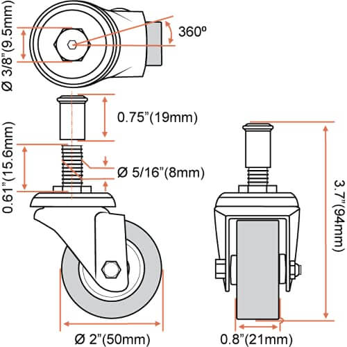 INSTANT MOBILITY: 2″ diameter x 3/4″ width wheel; 3.7″ overall height; smooth, quiet and non-marking polyurethane wheels. Threaded-post mount, 3/8″ X 5/16″ with with hex based; splint nuts included (Stem sleeve insert to secure it to the creeper cart).