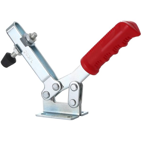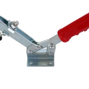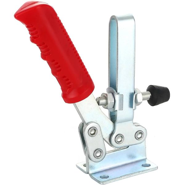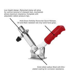 MATERIAL: Heavy duty toggle clamps made of Cold-rolled carbon Steel with Zinc plated coating for corrosion resistance; Oil and Stain resistant red vinyl solid hand grips, complete with adjustable rubber pressure tips.