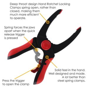 UTILITY: These Deep throat design Hand Ratchet Locking Clamps spring open, rather than closed, making them much more efficient to operate. Just press the trigger” and the clamp opens fully.
