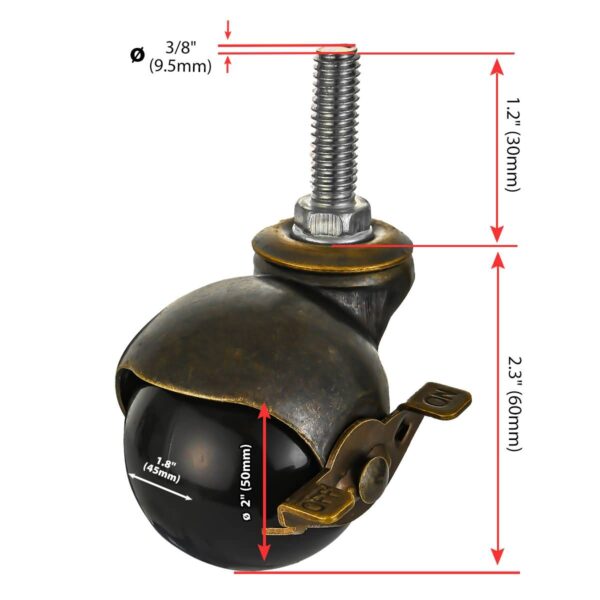 SMOOTH AND QUITE: 65 LBS per swivel furniture ball wheels. Threaded Stem Width: 3/8″ (9.5mm). Threaded Stem Length: 1.2″ (30mm). Caster Wheel Width: 1.8″ (45mm). Caster Wheel Diameter: 2″ (50mm). Overall Height: 2.3″ (60mm).