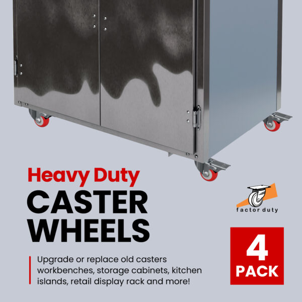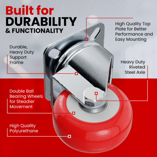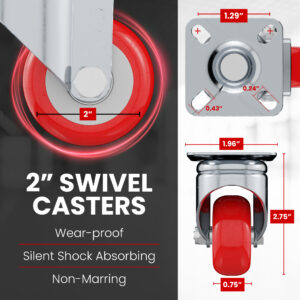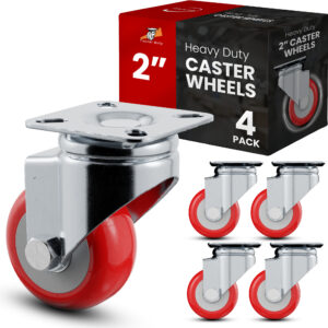 WHEEL MATERIALS AND PERFORMANCE: Heavy duty casters made of polyurethane wheels. COLOR: Red. Ball bearings: Double ball bearings. Premium Caster wheels are made of high-quality polyurethane wheels with strong abrasion resistance, silent shock absorber, wearproof, no drag marks and enhance the impact resistance of the whole caster.