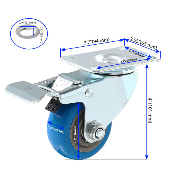 PLATE SIZE: 2.55″ (65mm) X 3.7″ (94mm). Hole Center To Hole Center: 1.77″ (45mm) X 2.95″ (75mm). 3 inch Caster Wheels with Brake.