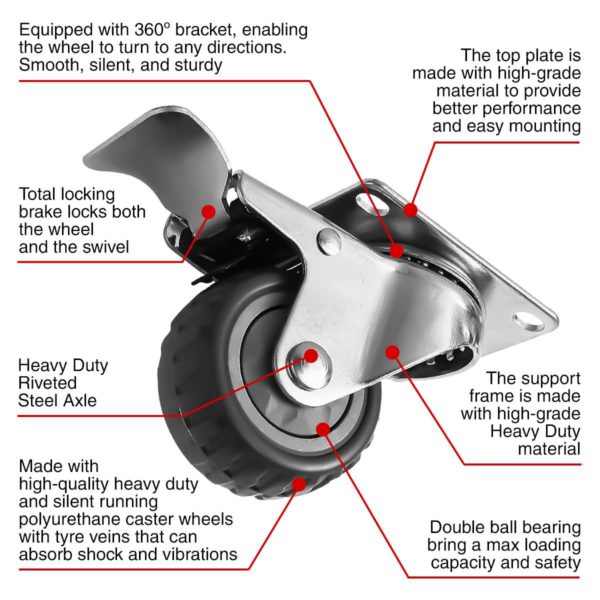 WHEEL MATERIALS AND PERFORMANCE: Heavy duty casters made of popular polyurethane type with tyre veins , very quiet running, absorbs shock and vibrations. Double ball bearing bring a max loading capacity and safety.