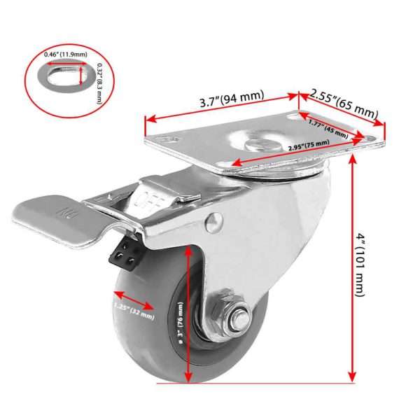 PLATE SIZE: 2.55″ (65mm) x 3.7″ (94mm). Hole center to hole center: 1.77″ (45mm) x 2.95″ (75mm). 3 Inch Caster Wheels with Brake.