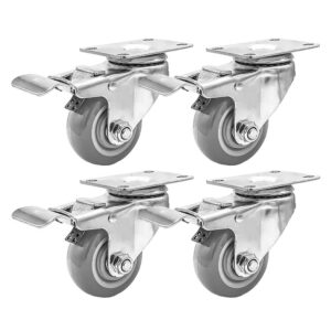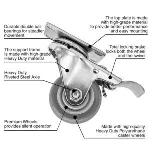WHEEL MATERIALS AND PERFORMANCE: Heavy duty casters made of polyurethane wheels. COLOR: Grey. Ball bearings: Double ball bearings. Premium Caster wheels are made of high quality polyurethane wheels with strong abrasion resistance, silent shock absorber, wearproof, no drag marks and enhance the impact resistance of the whole caster.