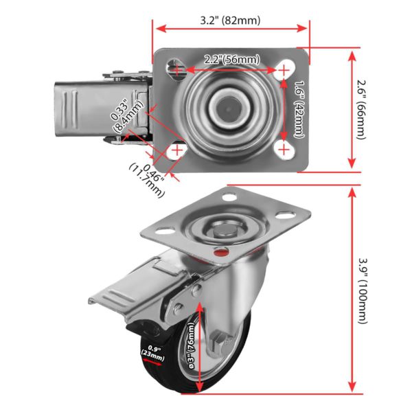 HEAVY DUTY CASTER WHEELS: Double ball bearing for each wheel, moving smooth, the load capacity for each casters is more than 300lbs. Plate Size: 2.6″ (66mm) x 3.2″ (82mm). Hole center to hole center: 1.6″ (42mm) x 2.2″( 56mm). Mounting hole dimensions: 0.33″ (8.4mm) x 0.46″ (11.7mm)). Overall Height: 3.9″ (100mm). Caster Wheel Diameter: 3″ (76mm). Caster Wheel Width: 0.9″ (23mm). Caster Wheel Material: Rubber. Caster Wheel Color: Black.