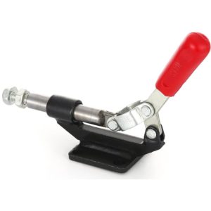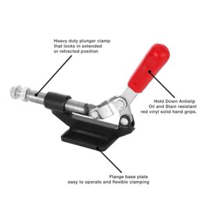HORIZONTAL HANDLE: Toggle clamp flaunts an easy-to-use ribbed plastic handle that offers comfort, optimal adjustability and push pull action that allows the plunger to move in and out along the axis.