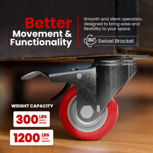 360-DEGREE MANEUVERABILITY: These polyurethane caster wheels equipped with 360 degrees swivel bracket, the wheels can turn to any directions. Smooth and Silent and Sturdy. Capacity: 300lbs each wheel. Move the light furniture, table, cabinet and equipment to the destination more easily and flexibly.