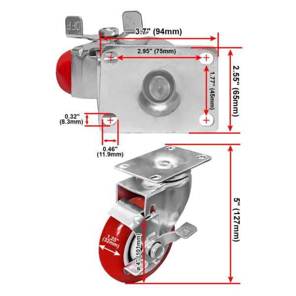 PLATE SIZE: 2.55″ (65mm) X 3.7″ (94mm). Hole Center To Hole Center: 1.77″ (45mm) X 2.95″ (75mm). Overall Height: 5″ (127mm). Caster Wheel Diameter: 4″ (101mm), Caster Wheel Width: 1.25″ (32mm), Caster Wheel Material: Polyurethane.