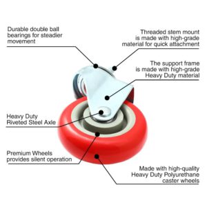 QUALITY AND DURABILITY: Made with Polyurethane for sturdiness and durability. Polyurethane makes casters resistant to most chemicals, oils, acids, grease, and water for a long lifespan.