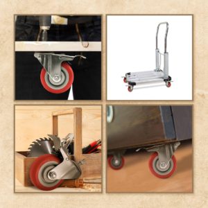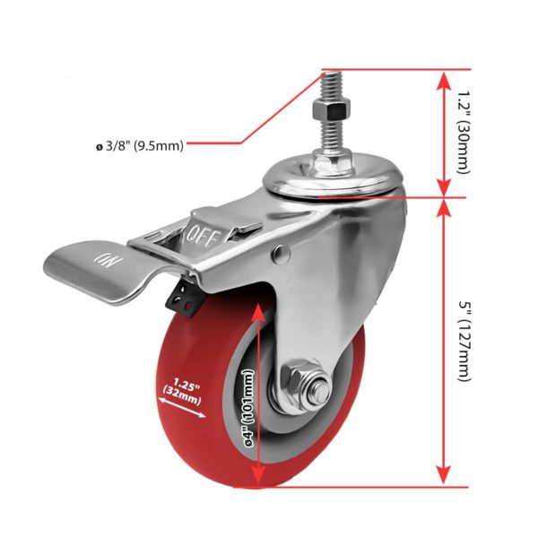 CASTER WHEEL SIZE: Caster Wheel Diameter: 4″ (101mm). Caster Wheel Width: 1.25″ (32mm). Overall Height: 5″ (127mm). Caster Wheel Color: RED. Ball bearings: Double ball bearings. Capacity: 65lbs each polyurethane caster wheel.