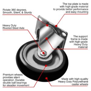 WHEEL MATERIALS AND PERFORMANCE: Heavy duty casters made of polyurethane wheels. COLOR: Black. Ball bearings: Double ball bearings. Premium Caster wheels are made of high quality polyurethane wheels with strong abrasion resistance, silent shock absorber, wearproof, no drag marks and enhance the impact resistance of the whole caster.