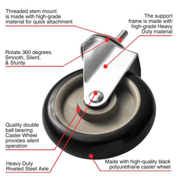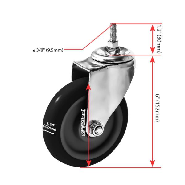 CASTER WHEEL SIZE: Caster Wheel Diameter: 5″ (127mm). Caster Wheel Width: 1.25″ (32mm). Overall Height: 6″ (152mm). Caster Wheel Color: Black. Ball bearings: Double ball bearings. Capacity: 350lbs each polyurethane caster wheel.
