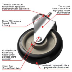 QUALITY AND DURABILITY: Made with Polyurethane for sturdiness and durability. Polyurethane makes casters resistant to most chemicals, oils, acids, grease, and water for a long lifespan.