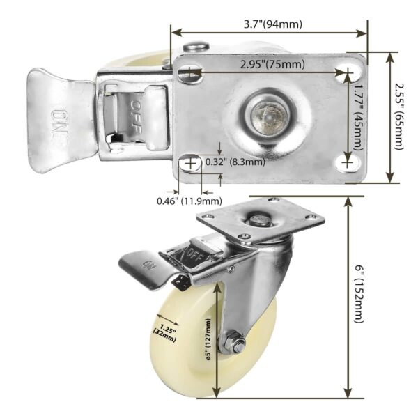 PLATE SIZE: 2.55″ (65mm) x 3.7″ (94mm). Hole center to hole center: 1.77″ (45mm) x 2.95″ (75mm). 5 Inch Caster Wheels with Brake.