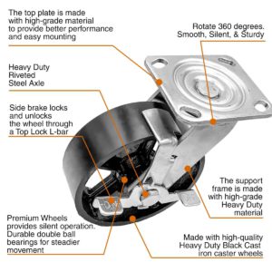 HEAVY DUTY CONSTRUCTION: The support frame and top plate are made of high quality iron wiith double roller bearing for each vintage wheel, moving smooth, the load capacity for each casters is 1,000lbs, and it’s up to 4,000lbs for 4pcs vintage caster wheels.