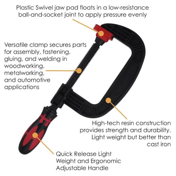 FEATURES: Ratchet structure design heavy duty c clamp has Quick Release Feature and Ergonomic Adjustable Handle. The pivoting handle helps in tight spots.