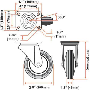 HEAVY DUTY CASTER WHEELS: Double ball bearing for each wheel, moving smooth, the load capacity for each casters is more than 650lbs. Plate Size: 4.3″ (135mm) x 4.1″ (105mm). Hole center to hole center: 2.9″ (75mm) x 4″ (103mm). Mounting hole dimensions: 0.4 (11mm) x 0.55 (14mm). Overall Height: 9.2″ (235mm). Caster Wheel Diameter: 8″ (200mm). Caster Wheel Width: 1.8″ (46mm). Caster Wheel Material: Rubber. Caster Wheel Color: Black.