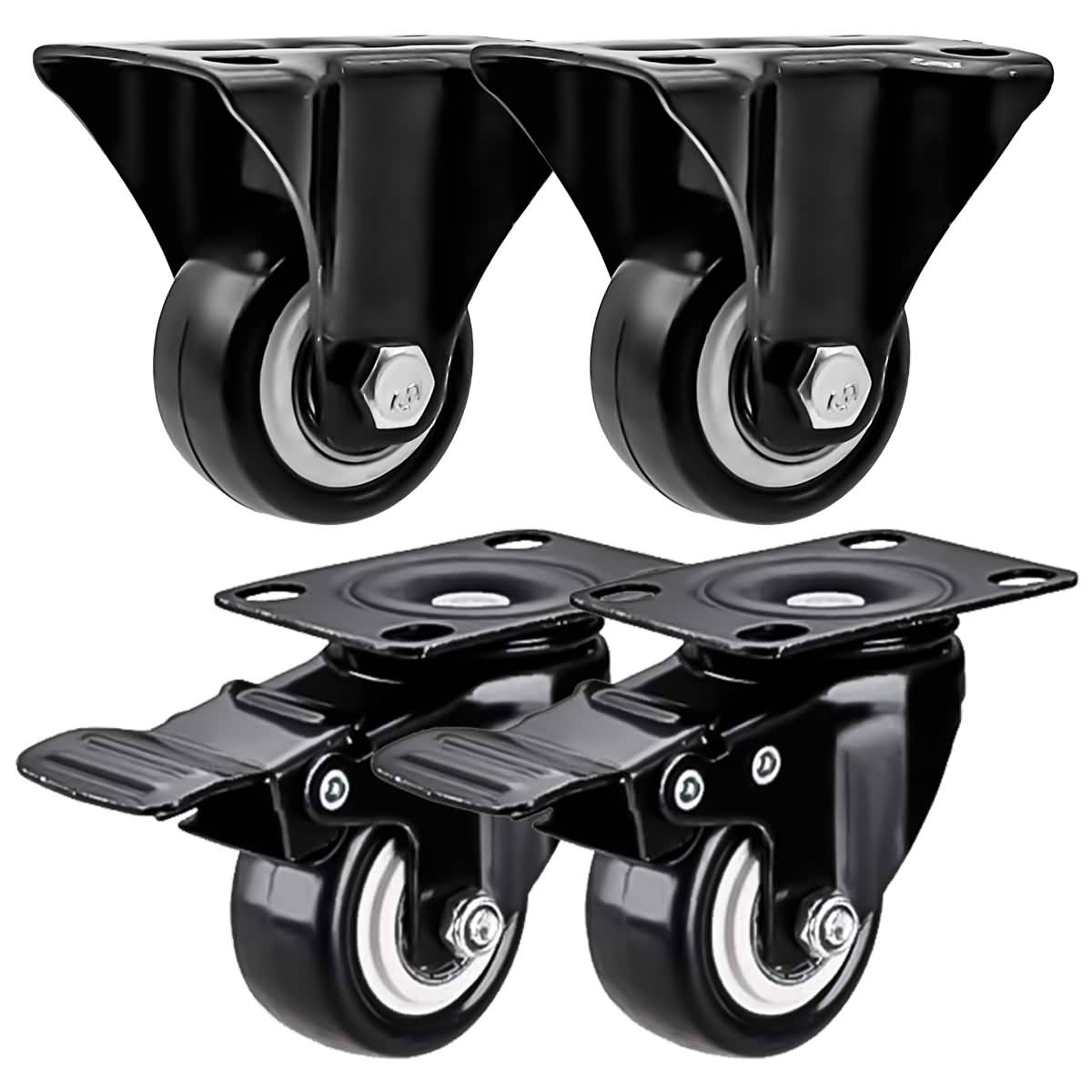 4 Pack Combo 1.5 inch All Black PU Caster 2 Non Swivel Fixed Rigid & 2 With Brake