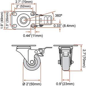 HEAVY DUTY CASTER WHEELS: Double ball bearing for each wheel, moving smooth, the load capacity for each casters is more than 150lbs. Plate Size: 1.9″ (49mm) x 2.7″ (70mm). Hole center to hole center: 1.3″ (35mm) x 2″ (52mm). Mounting hole dimensions: 0.33″ (8.4mm) x 0.44″ (11mm)). Overall Height: 2.7″ (70mm). Caster Wheel Diameter: 2″ (50mm). Caster Wheel Width: 0.9″ (23mm). Caster Wheel Material: Polyurethane. Caster Wheel Color: All Black.