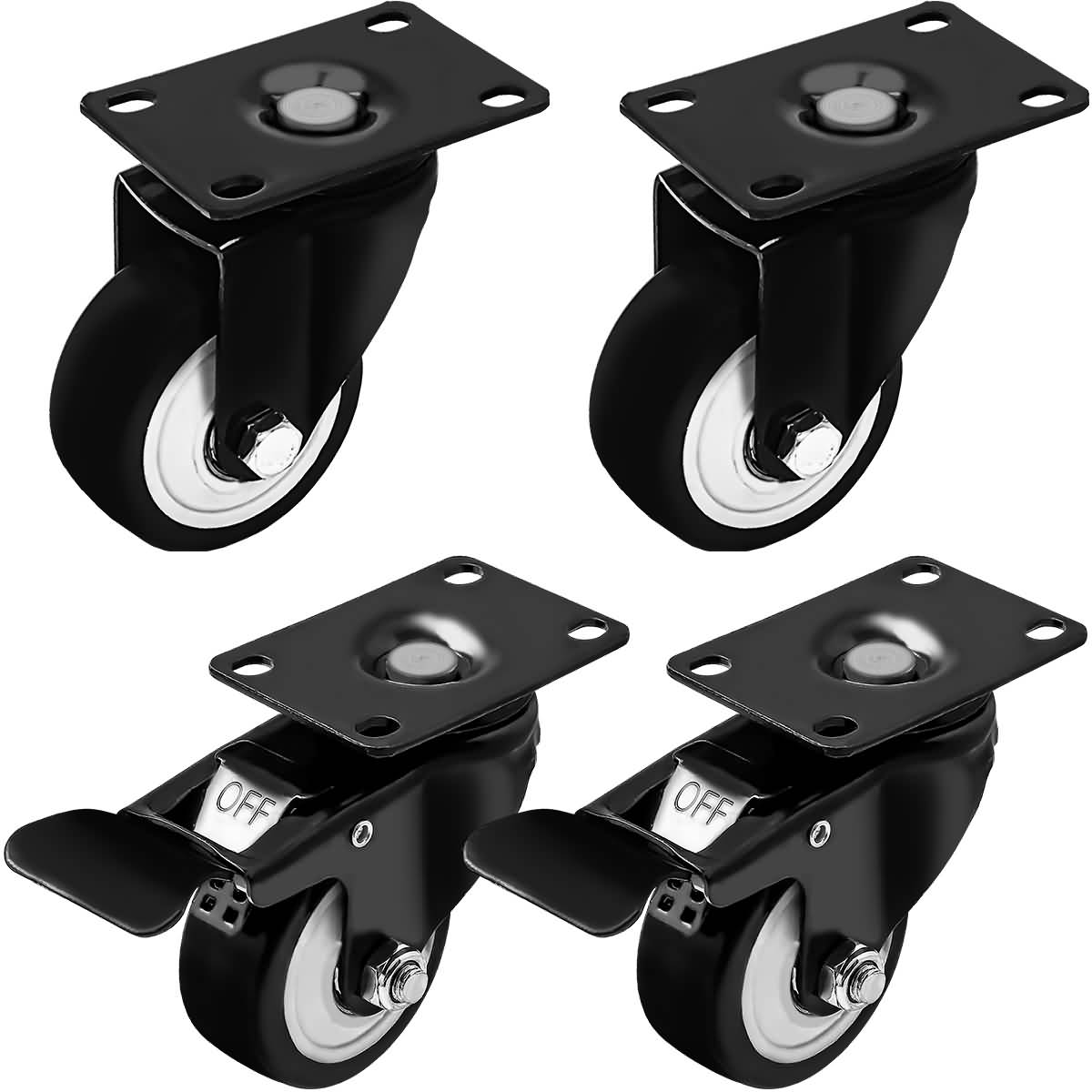 4 Pack Combo 3 inch All Black PU Swivel Caster 2 No Brake & 2 With Brake