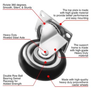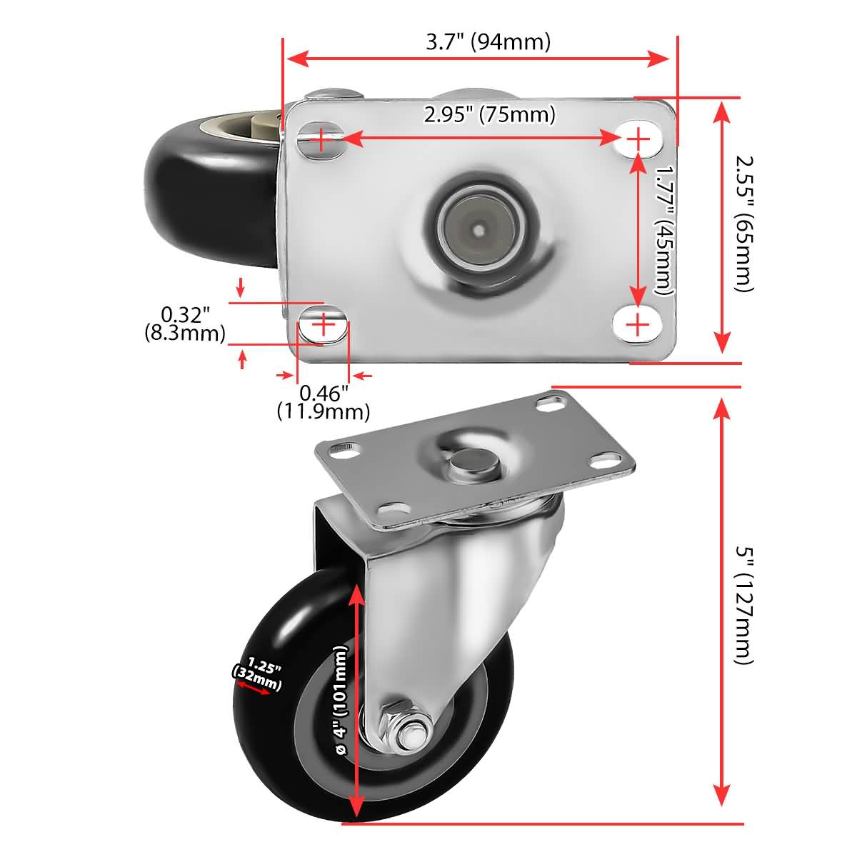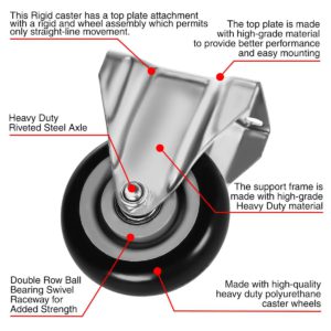CASTER WHEEL: Caster Wheel Diameter: 4″ (101mm). Caster Wheel Width: 1.25″ (32mm). Caster Wheel Material: Polyurethane. Caster Wheel Color: Black. Heavy Duty Caster Wheels are made of high quality polyurethane wheels with strong abrasion resistance, silent shock absorber, wearproof, no drag marks and enhance the impact resistance of the whole caster.