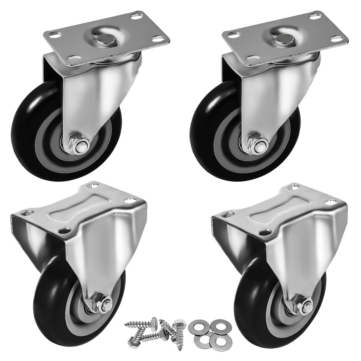 4 Pack Combo 4 inch Black PU 2 Swivel & 2 Non Swivel Fixed Rigid With Hardware