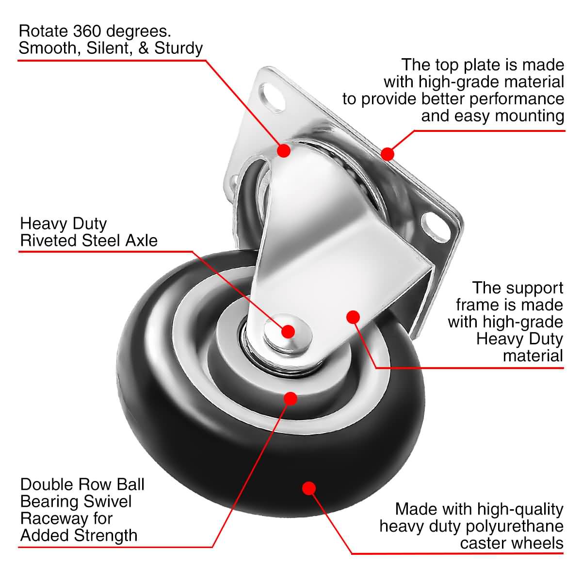 PLATE SWIVEL CASTER: Swivel casters rotate 360 degrees which makes turning the mating equipment possible. It’s good for transporting furniture and displays quietly and safely.