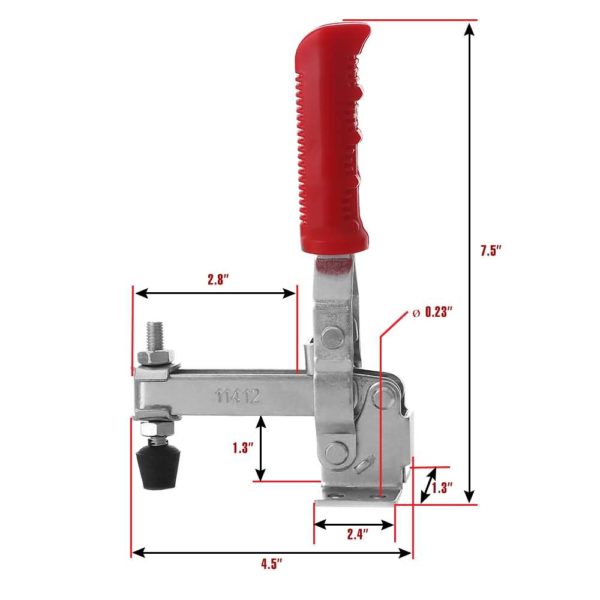 TOGGLE CLAMP SIZE: Vertical quick release long bar toggle clamp – Height 7.5″, Width 4.5″, Height Under Bar 1.3″, Bar Length 2.8″, Plate Size 2.4″ x 1.3″, Mounting hole dimensions 0.23″.