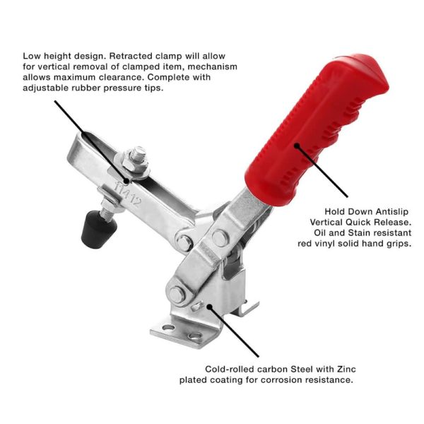 MATERIAL: Heavy duty toggle clamps made of cold-rolled Carbon Steel with Zinc plated coating for corrosion resistance; Oil and Stain resistant red vinyl solid hand grips, complete with adjustable rubber pressure tips.