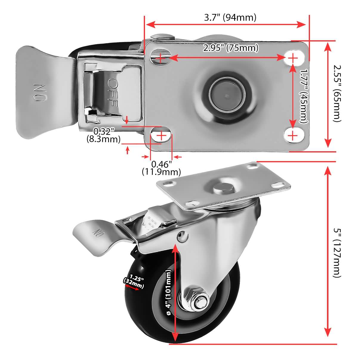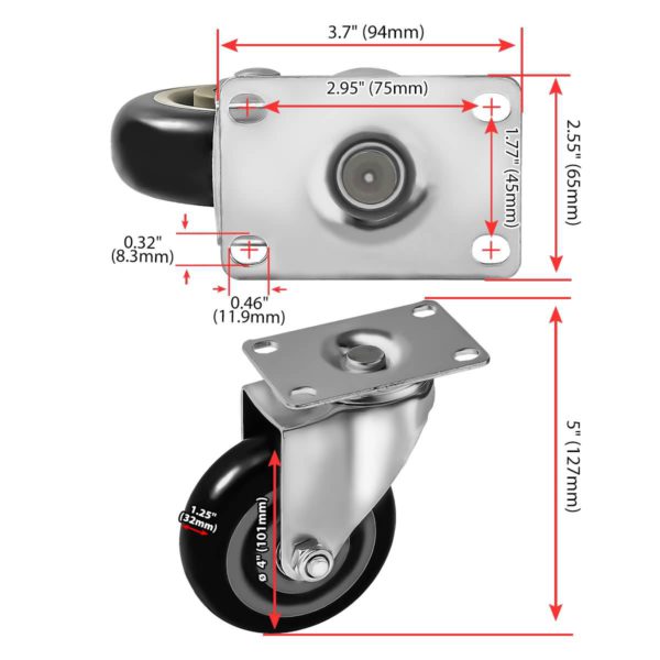 PLATE SIZE: 2.55″ (65mm) X 3.7″ (94mm). Hole Center To Hole Center: 1.77″ (45mm) X 2.95″ (75mm). 4 inch Caster Wheels Combo.