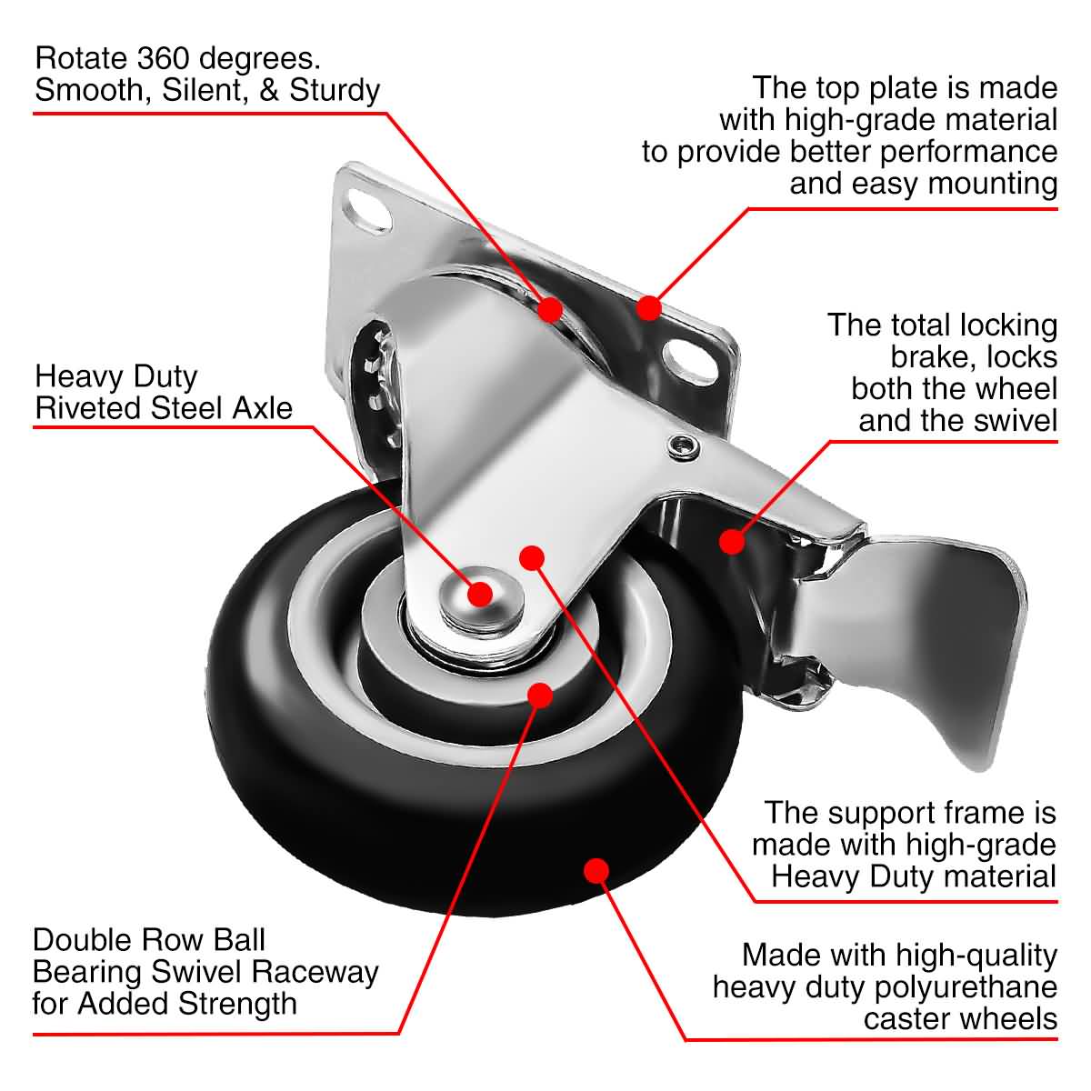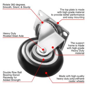 WHEEL MATERIALS AND PERFORMANCE: Heavy duty casters made of polyurethane wheels. COLOR: Black. Ball bearings: Double ball bearings. Premium Caster wheels are made of high quality polyurethane wheels with strong abrasion resistance, silent shock absorber, wearproof, no drag marks and enhance the impact resistance of the whole caster.