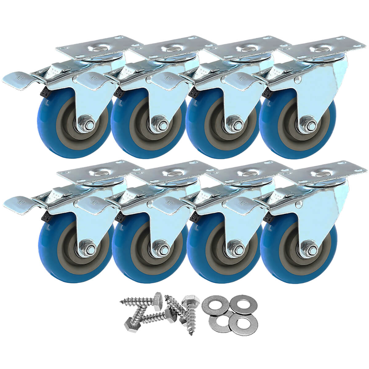8 Pack 4 inch Blue PU Swivel Caster Brake with Hardware