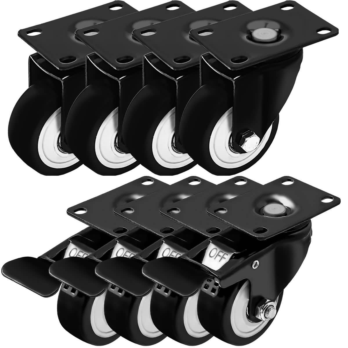 8 Pack Combo 3 inch All Black PU Swivel Caster 4 No Brake & 4 With Brake