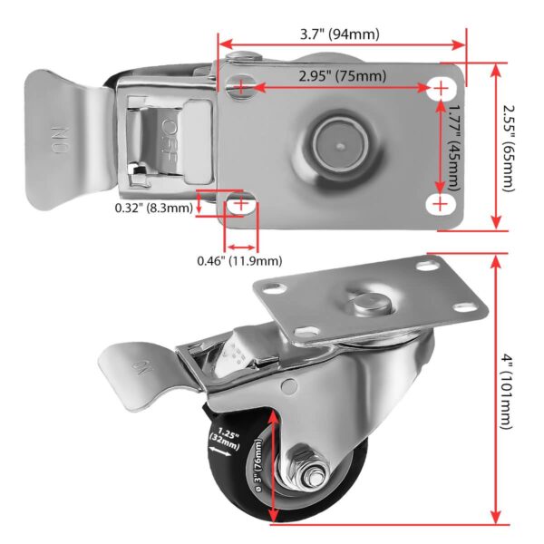PLATE SIZE: 2.55″ (65mm) X 3.7″ (94mm). Hole Center To Hole Center: 1.77″ (45mm) X 2.95″ (75mm). 3 inch Caster Wheels Combo.