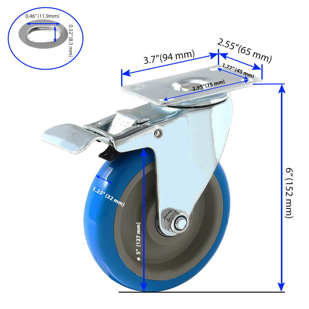 PLATE SIZE: 2.55″ (65mm) X 3.7″ (94mm). Hole Center To Hole Center: 1.77″ (45mm) X 2.95″ (75mm). 5 inch Caster Wheels No Brake.