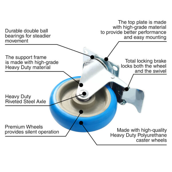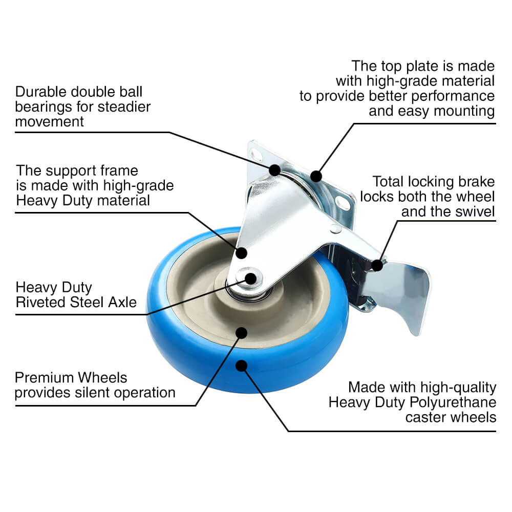 WHEEL MATERIALS AND PERFORMANCE: Heavy duty casters made of polyurethane wheels. COLOR: Blue. Ball bearings: Double ball bearings. Premium Caster wheels are made of high quality polyurethane wheels with strong abrasion resistance, silent shock absorber, wearproof, no drag marks and enhance the impact resistance of the whole caster.