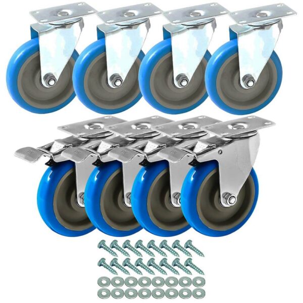 8 Pack Combo 5 inch Blue PU Swivel Caster 4 No Brake & 4 Brake With Hardware